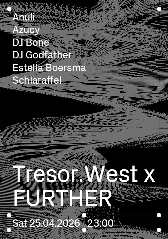 On Sat 25.04.2026, DJ Bone visits Tresor.West to showcase his label FURTHER. Detroit pioneers DJ Bone and DJ Godfather share the T.W. Floor with Azucy and Estella Boersma, guided through the night by our resident Anuli. A night celebrating the label’s vision and the Motor City’s legacy. Schlaraffel takes over the UFO Floor all night long. Expect a wild ride through UK sounds.